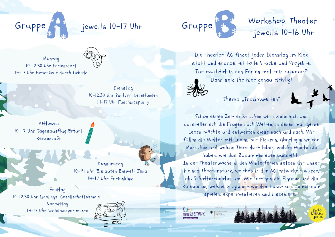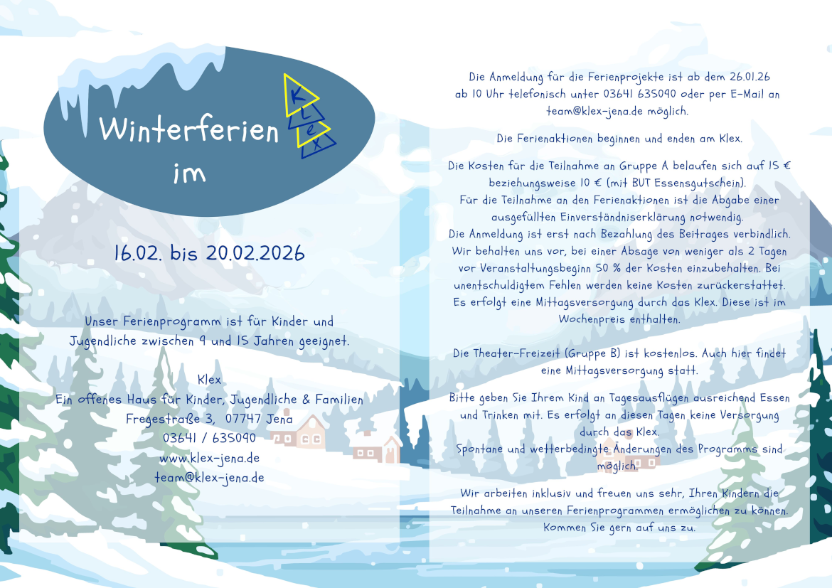 Die Anmeldung für die Ferienprojekte ist ab dem 26.01.2026 ab 10:00 Uhr telefonisch unter 03641 635090 oder per E-Mail an team@klex-jena.de möglich.